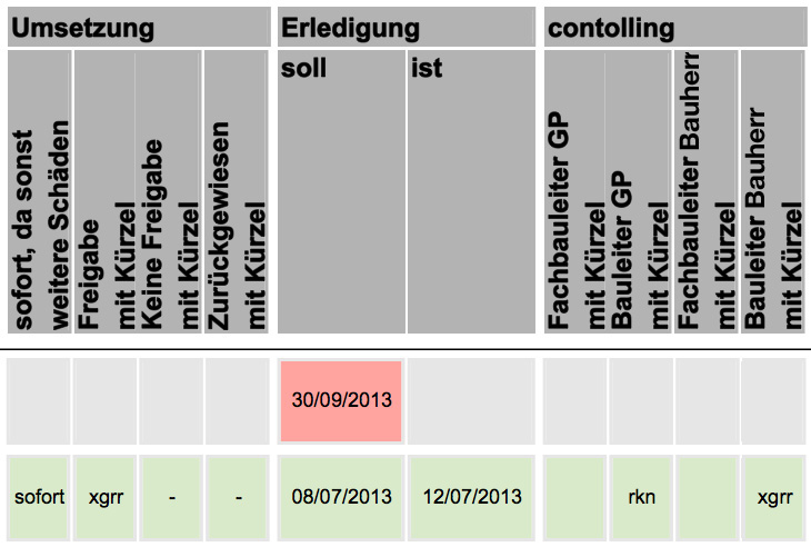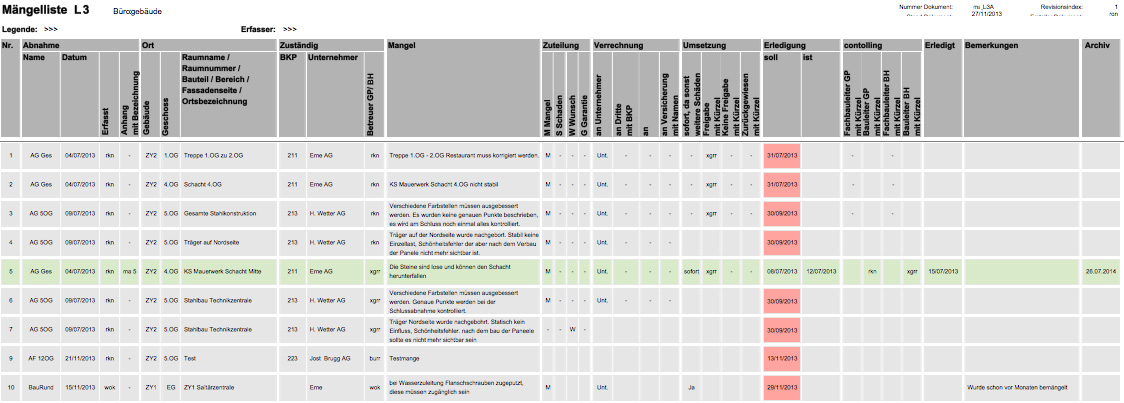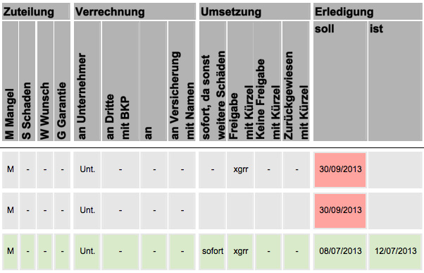 - ...in Kolonnen für die Zuteilung des Mangels in vordefinierte Kategorien, die Verrechnungsmodalitäten, die Umsetzung, den Termin für die Behebung des Mangels (Erledigung)...