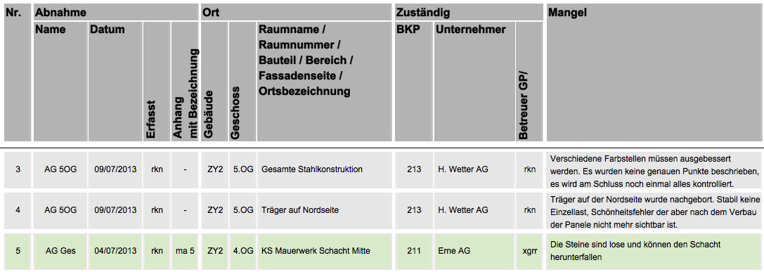 - In Kolonnen für die Nummerierung des Mangels/Schaden, die Abnahme (Datum und durch wen), der genaue Ort, die Zuständigkeit, eine detaillierte Beschreibung des Mangels...