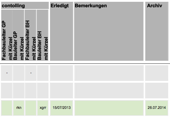 - ...und schliesslich in Kolonnen für die verschiedenen Controlling-Instanzen, den Zeitpunkt der Erledigung, Bemerkungen, und den Zeitpunkt der Archivierung